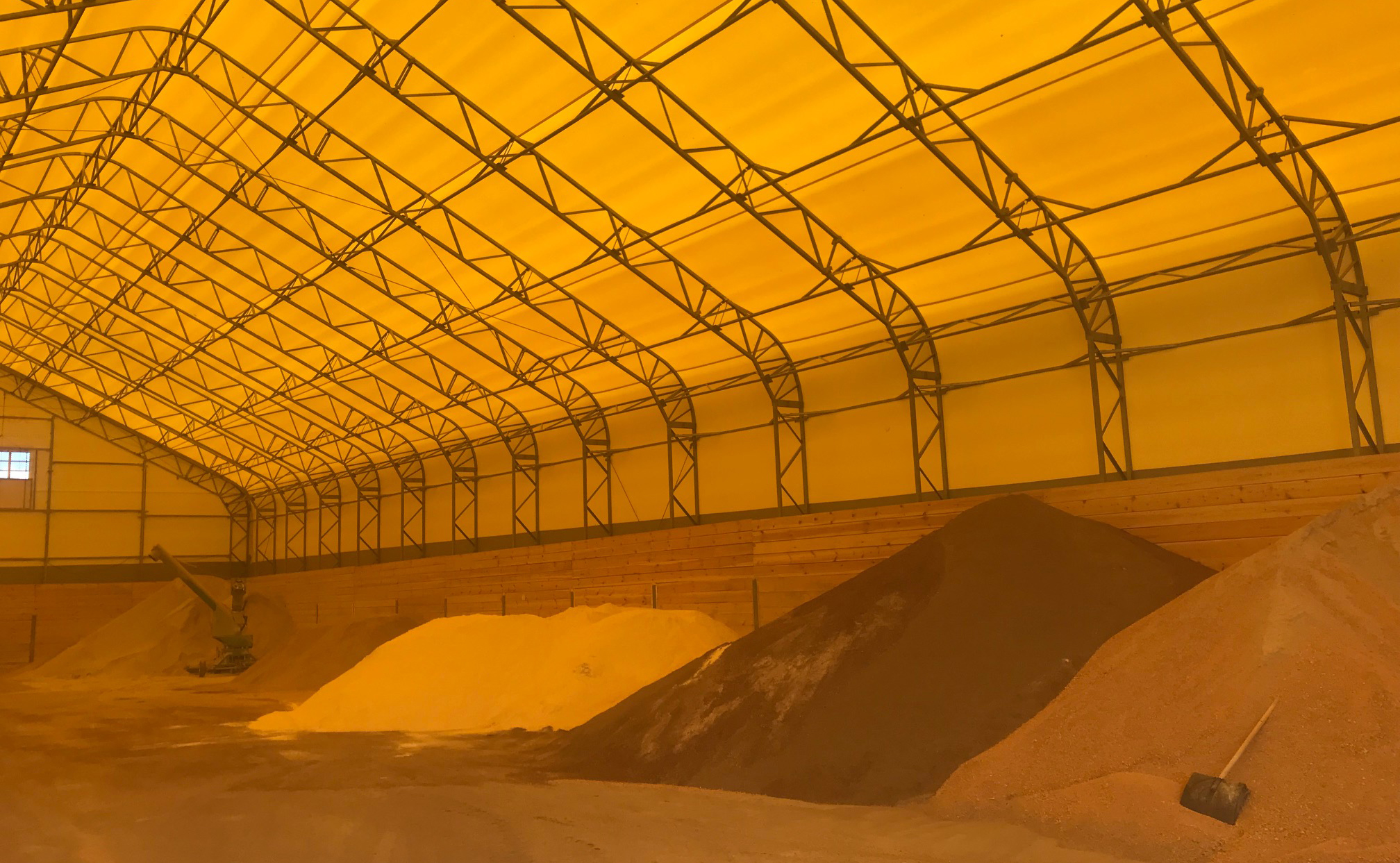 Двускатная крыша со скругленными карнизными и коньковыми элементами обеспечивает эффективный сход снега и воды, исключая скопление осадков. Шарнирное опирание компенсирует сезонные подвижки грунта и гарантирует устойчивость конструкции. Холодное исполнение идеально подходит для складов, где главное – сухость, свежий воздух и защита от внешних воздействий.